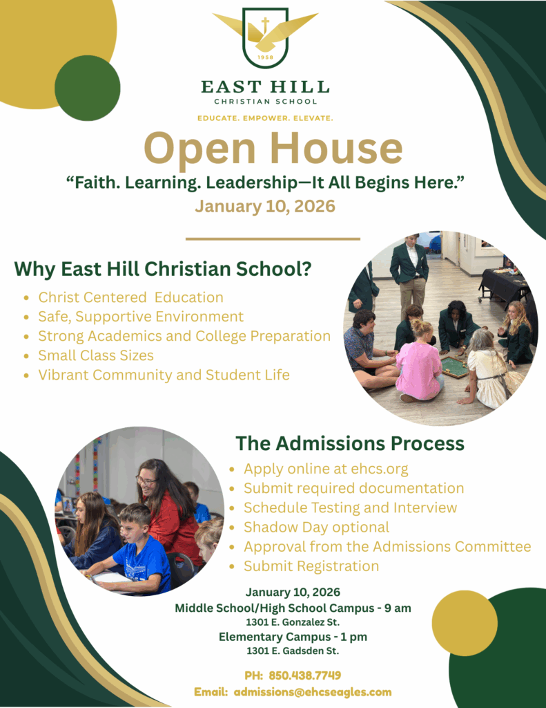 We invite you to explore our campuses nestled in the heart of historic East Hill. Whether you’re interested in seeing life on our MS/HS campus for grades 6-12 or experiencing the joyful sounds of our elementary students at our elementary campus, we offer personalized tours tailored to your needs. To schedule a tour of our Gonzalez Street campus (grades 6-12) or the Gadsden Street Campus (grades VPK-5th), reach out to Deb Hawkins at d_hawkins@ehcseagles.com or (850)438-7746. Tours for the 2026-2027 school year will begin on November 12, 2025.